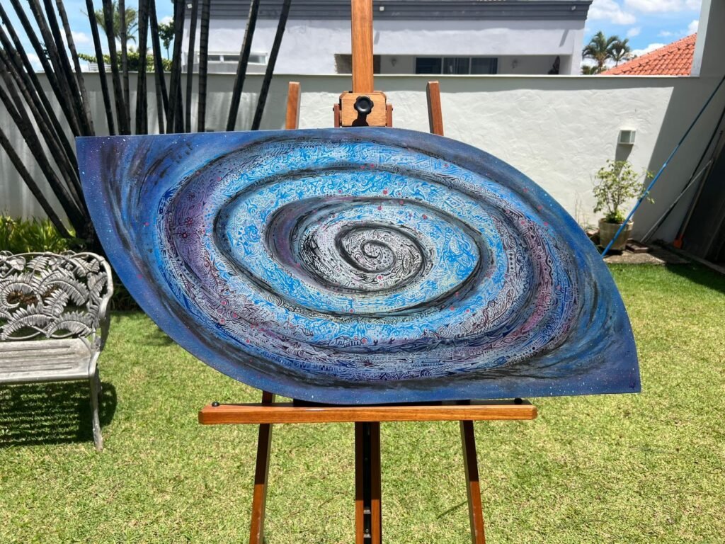 A dive into the raw essence of beginnings, where stars are born and time unfolds. What lies at the heart of everything? A journey into the origins of the universe and our souls. “Origins” represents our inner universe, as vast as the cosmos: infinite in its significance and symbols. A unique mixed technique combines graffiti spray with detailed ink dip pen work.