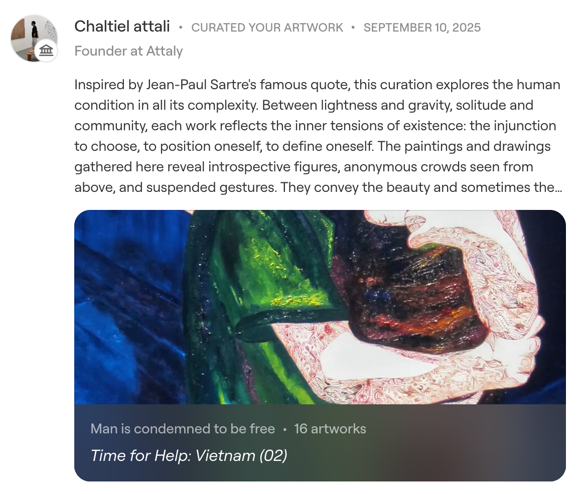 “Inspired by Jean-Paul Sartre’s famous quote, this curation explores the human condition in all its complexity. Between lightness and gravity, solitude and community, each work reflects the inner tensions of existence: the injunction to choose, to position oneself, to define oneself. The paintings and drawings gathered here reveal introspective figures, anonymous crowds seen from above, and suspended gestures.