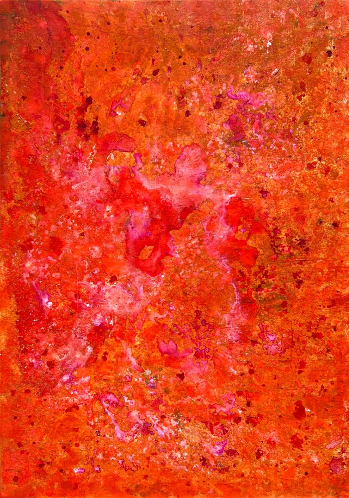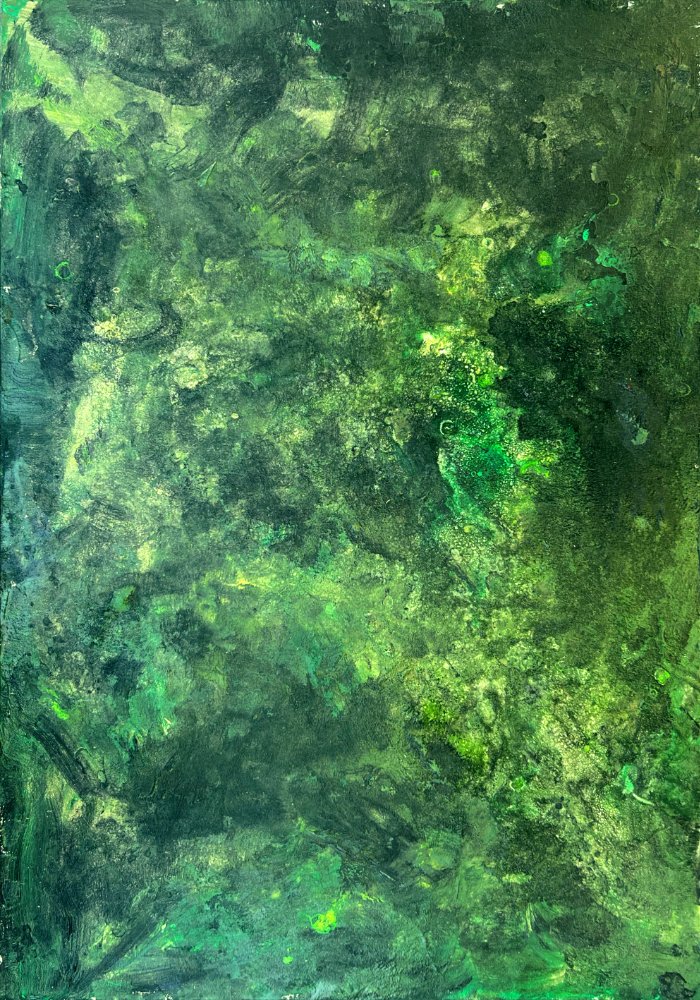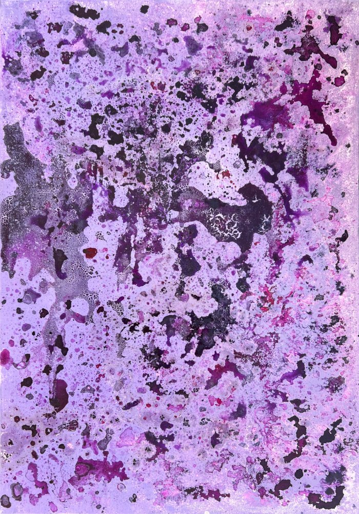 “Water and Oil Don’t Mix” is both the title and the guiding principle of this project. Mirela Fioresy takes a fundamental lesson from painting – that oil and acrylic will never blend – and transforms it into a method for discovery. By layering these materials on a single surface, she allows their resistance to guide the outcome, watching pigments push, repel, and settle into surprising organic forms. This encounter becomes both process and metaphor, capturing moments of tension, separation, and uneasy coexistence.